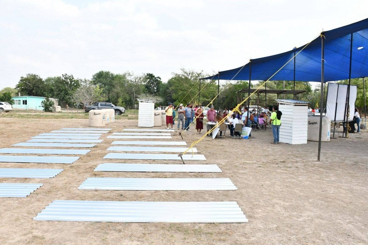 Durante la jornada, se distribuyeron letrinas ecológicas, paquetes de láminas y tinacos, los cuales contribuirán a garantizar mejores condiciones de salud, seguridad y almacenamiento de agua en las viviendas de la comunidad.